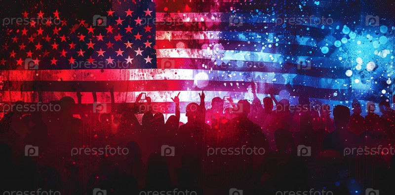 Цифровая эпоха и патриотизм в толпе, стоящей перед киберамериканским флагом