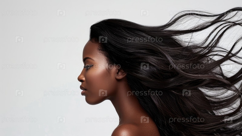 Шелковистые темные волосы в элегантном движении. Студийный портрет