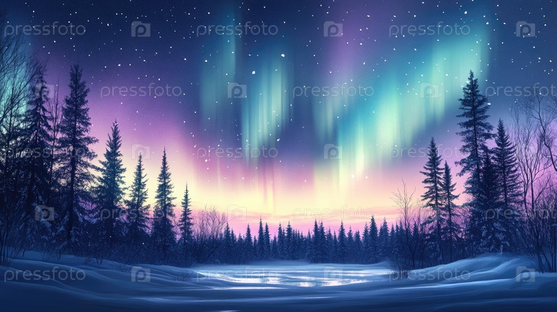 Волшебный зимний лес, освещенный северным сиянием