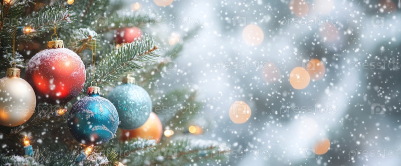 Красиво украшенная рождественская елка с разноцветными игрушками и падающими снежинками создает праздничное и радостное предпраздничное настроение