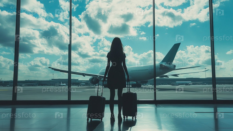 Одинокий путешественник стоит на рассвете, с нетерпением предвкушая свое следующее путешествие, в то время как самолеты ждут на залитой солнцем взлетной полосе