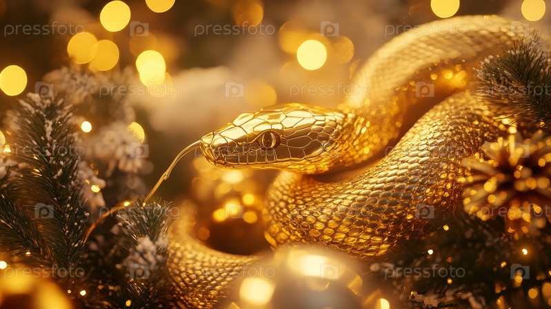 Золотая змея среди сверкающих огней и праздничного декора