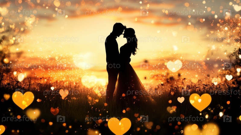 Вдохновляющие эмоции и нежные чувства запечатлены на этом захватывающем снимке пары, целующейся под закатным небом, усыпанным сердечками