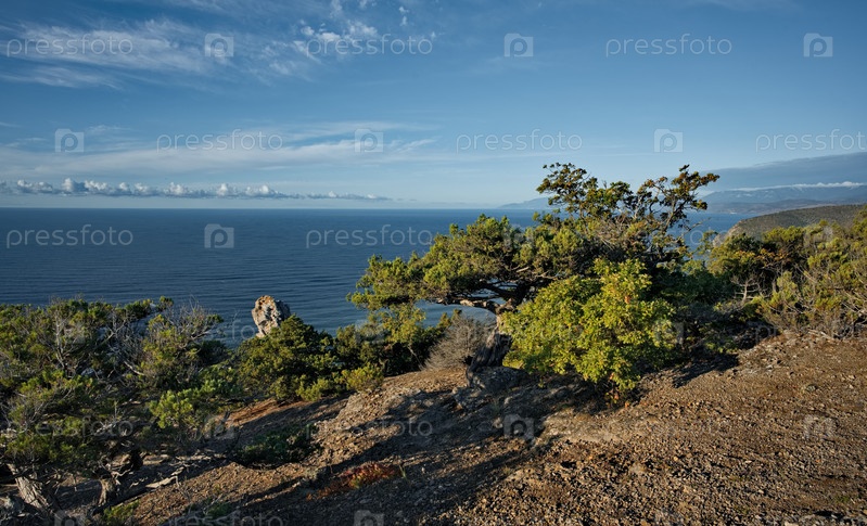 Россия, Республика Крым. Вид с труднодоступной туристической тропы на берег Черного моря недалеко от города Судак