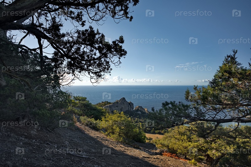 Россия, Республика Крым. Вид с труднодоступной туристической тропы на берег Черного моря недалеко от города Судак