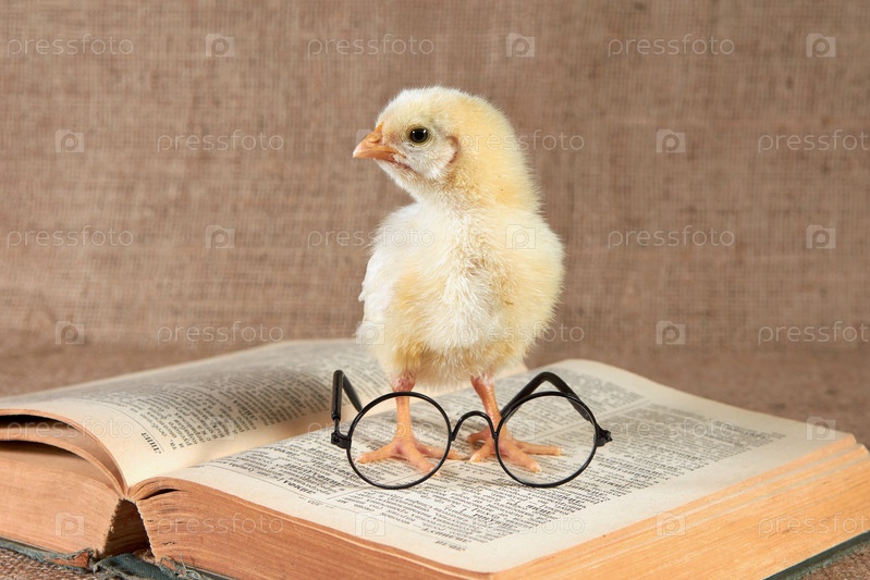 Маленький желторотый цыпленок в очках сидит на открытой книге