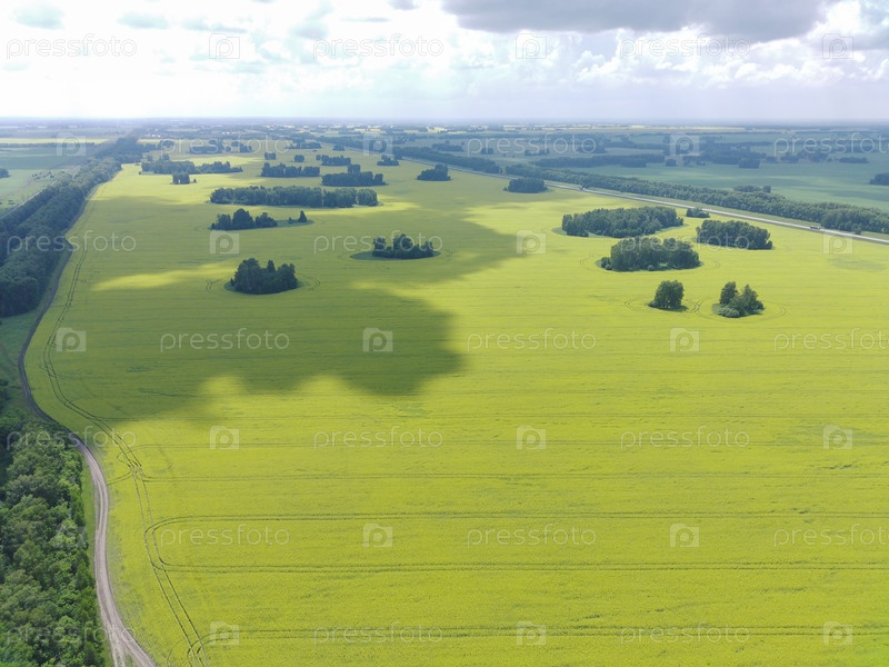 Поле цветущего рапса с высоты птичьего полета. Россия, Сибирь, Новосибирская область