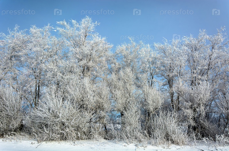 Спокойная зимняя сцена с покрытыми инеем ветвями, создающими волшебную белую страну чудес, снег покрывает землю под спящими деревьями