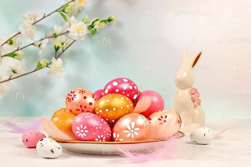Концепция счастливой Пасхи. Абстрактная пасхальная композиция с розовыми и золотыми украшенными яйцами, перьями, цветущими ветвями и цветами. Баннер для экрана с местом для текста приветствия