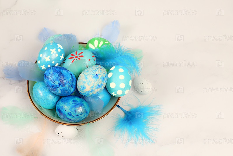 Концепция счастливой Пасхи. Абстрактная пасхальная композиция с синими украшенными яйцами и перьями в чашке. Баннер для экрана с местом для поздравительного текста