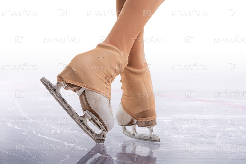 Детские белые коньки фигуриста, скользящего по льду - профессиональное фигурное катание