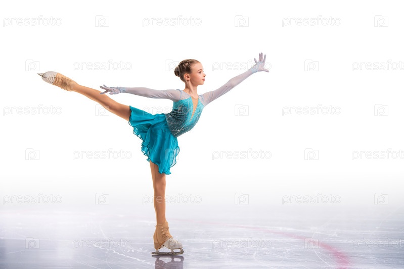 Молодая фигуристка в ярком костюме позирует. Портрет девушки на белом фоне
