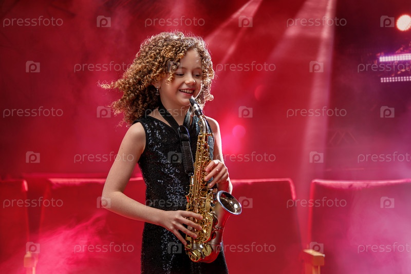 Молодая девушка-музыкант держит саксофон и улыбается