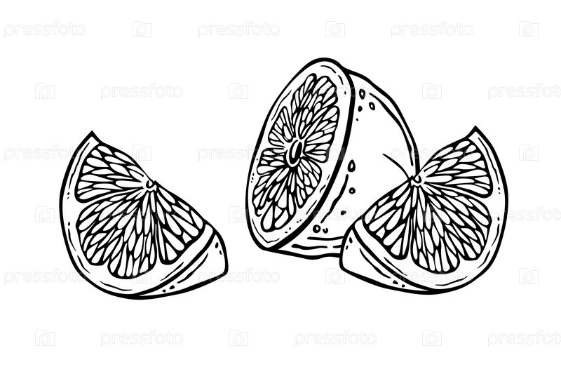 Кусочки лимона. Половинка и четверть. Черно-белая композиция из цитрусовых деревьев. Контурный рисунок фруктового десерта. Витаминовый ингредиент. Ручная графика для дизайна меню, логотипа или этикетки. Кусочки лимона. Половина и четвёрты. Чёрно-белый сос