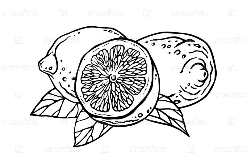 Лимоны. чернильная графическая композиция с целыми и разрезанными цитрусовыми на листьях. Схема тропических фруктов для этикеток, меню, дизайна упаковки, декора кухонных обоев или текстиля. Лимоны. Ink graphic composition with whole and half citrus fru