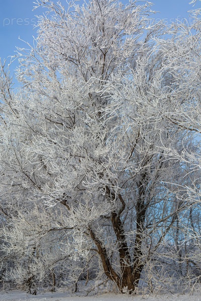 Спокойная зимняя сцена с покрытыми инеем ветвями, создающими волшебную белую страну чудес, снег покрывает землю под спящими деревьями