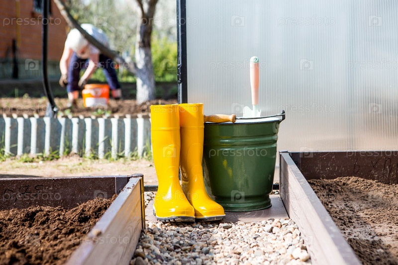 Желтые резиновые сапоги, ведро и маленькая лопатка в новой теплице. Концепция весенней посадки овощей и земледелия