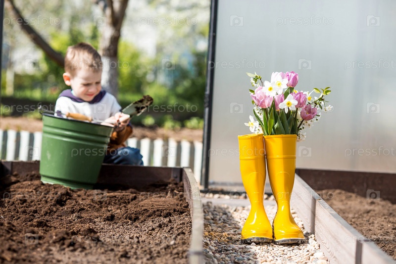 Желтые резиновые сапоги с букетом весенних тюльпанов и нарциссов. Ведро и небольшая лопатка в новой теплице. Концепция весенней посадки овощей и земледелия