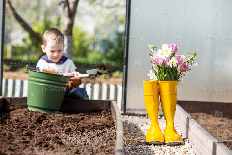 Желтые резиновые сапоги с букетом весенних тюльпанов и нарциссов. Ведро и небольшая лопатка в новой теплице. Концепция весенней посадки овощей и земледелия