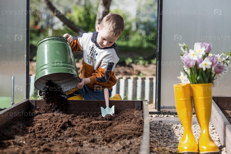 Маленький фермерский мальчик насыпает новую почву, почву для новой теплицы. Концепция весенней посадки овощей и обучения ребенка труду