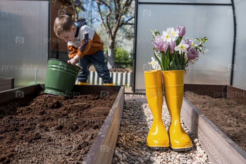 Маленький фермерский мальчик насыпает новую почву, почву для новой теплицы. Концепция весенней посадки овощей и обучения ребенка труду