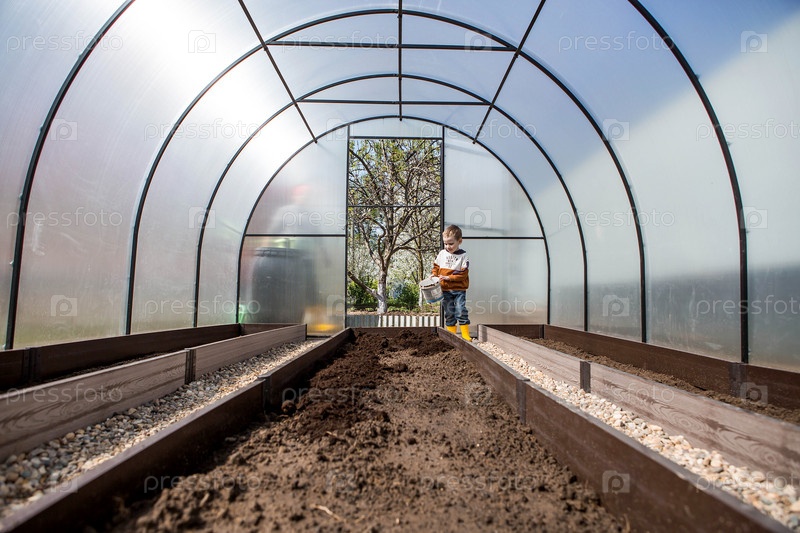 Маленький фермерский мальчик насыпает новую почву, почву для новой теплицы. Концепция весенней посадки овощей и обучения ребенка труду
