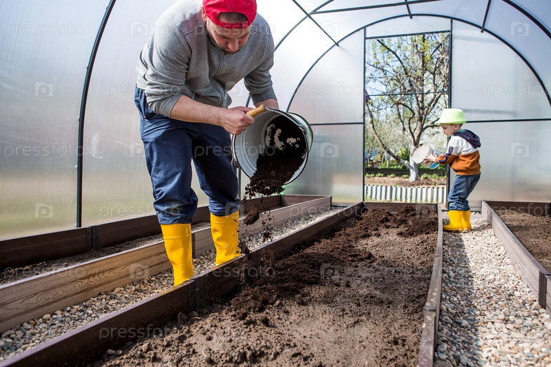 Мужчина-фермер насыпает новую почву, почву для новой теплицы. Концепция весенней посадки овощей, установки теплицы и фермерства