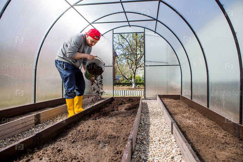 Мужчина-фермер насыпает новую почву, почву для новой теплицы. Концепция весенней посадки овощей, установки теплицы и фермерства
