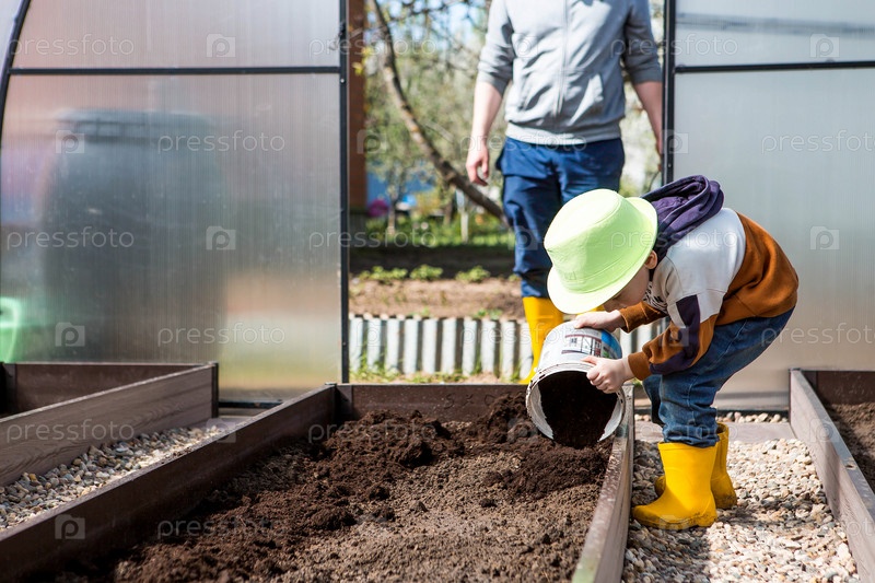 Маленький фермерский мальчик насыпает новую почву, почву для новой теплицы. Концепция весенней посадки овощей и обучения ребенка труду