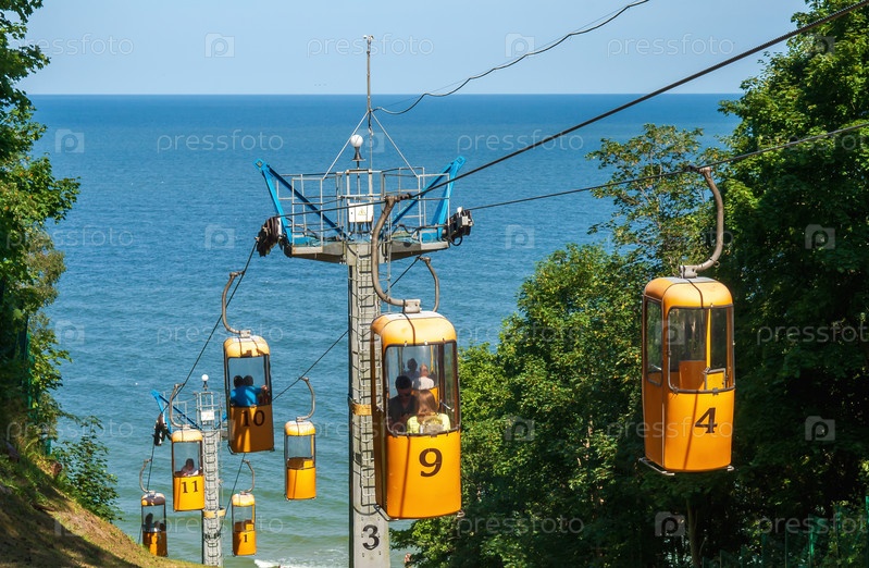 Светлогорск, Россия - 2021, 25 июля: Городская архитектура. Фуникулер к морю. Канатная дорога с кабинками желтого цвета