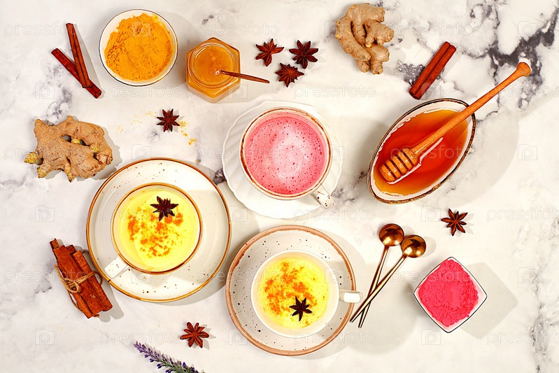 Разнообразие японских чаев латте из золотистой куркумы и розового лунного молока. Модный полезный напиток матча способствует снижению веса, расслабляет перед сном и обладает противовоспалительными свойствами