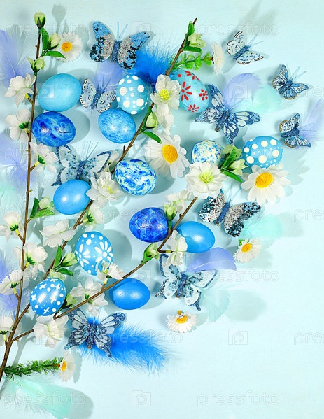 Абстрактная весенняя пасхальная композиция с синими расписными яйцами, перьями, бабочками, цветущими ветвями и цветами. Концепция счастливой пасхи. Экранный баннер