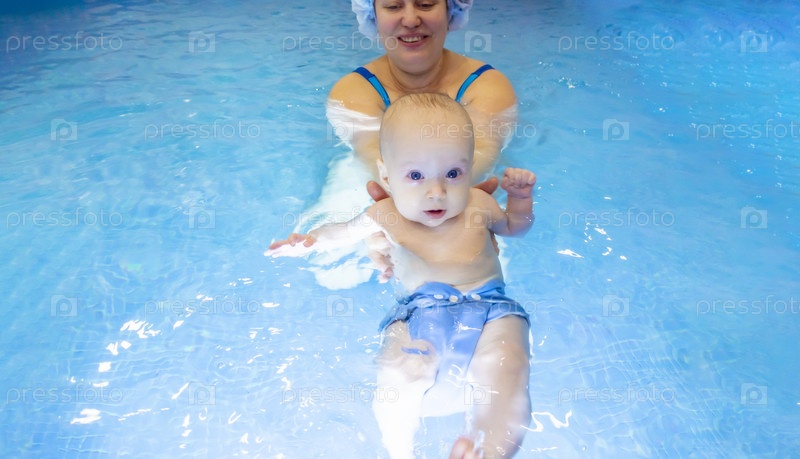 Очаровательная малышка наслаждается плаванием в бассейне со своей мамой. Занятия по раннему развитию для младенцев, обучение детей плаванию и нырянию