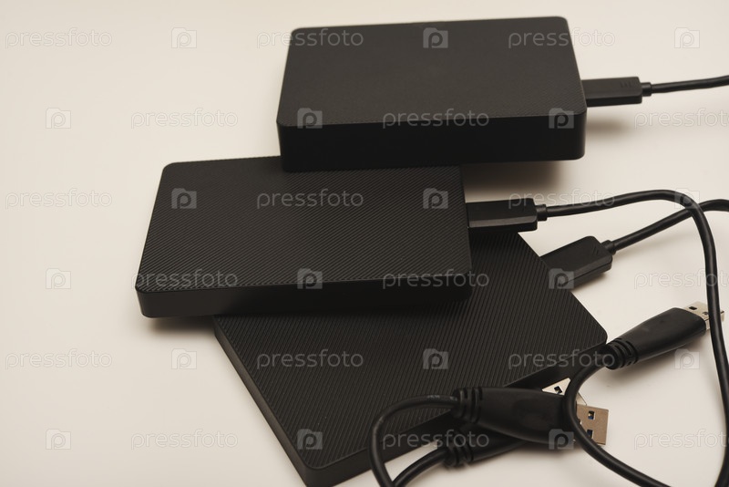 Жесткие диски на белом фоне.Современные устройства хранения данных с USB-проводами