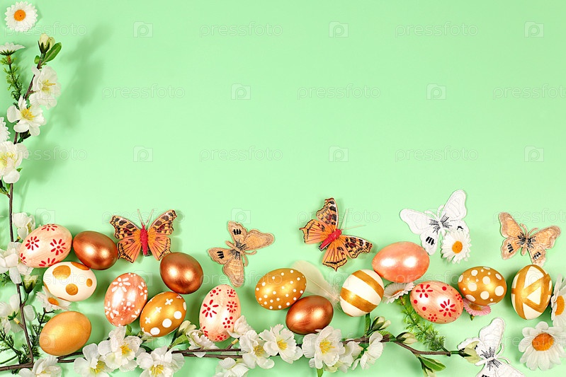 Абстрактная весенняя пасхальная композиция с золотыми расписными яйцами, перьями, бабочками, цветущими ветвями и цветами. Концепция счастливой пасхи. Экранный баннер с местом для текста приветствия