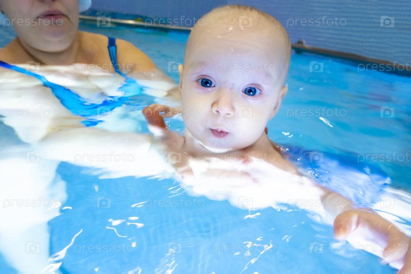 Очаровательная малышка наслаждается плаванием в бассейне со своей мамой. Занятия по раннему развитию для младенцев, обучение детей плаванию и нырянию