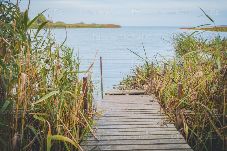 Старый причал на озере рано утром