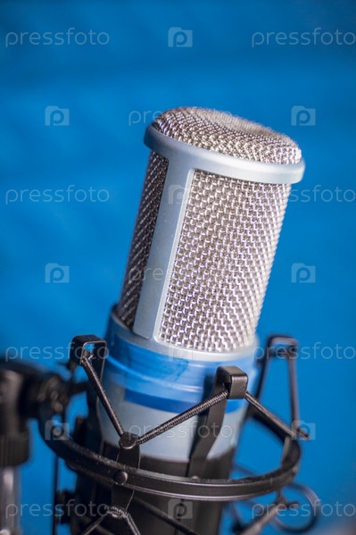 Микрофон в студии звукозаписи, крупный план, размытый фон