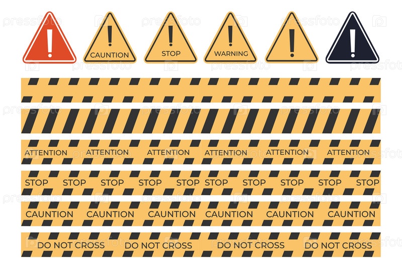 Векторный набор бесшовных лент. Указатель направления или предупреждающий ящик на необходимом маршруте. Знаки осторожности, опасности и предупреждения