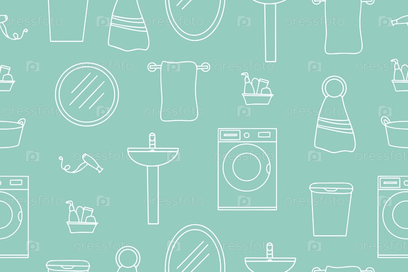 Бесшовный узор из иконок аксессуаров для ванной комнаты. Мебель, аксессуары, оборудование для ванной комнаты. Шаблоны. Векторная иллюстрация