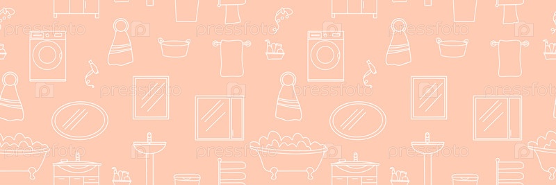 Бесшовный узор иконок мебели и аксессуаров для ванной комнаты. Оборудование для ванной комнаты в стиле каракули на розовом фоне. Вектор