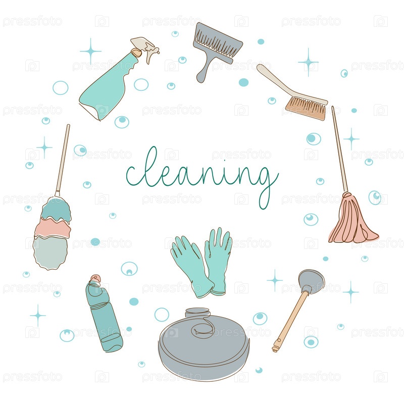 Нарисованный вручную набор уборочного оборудования, чистящие элементы в стиле эскиза каракули. Чистящие средства в современном стиле. Векторный фон, обои