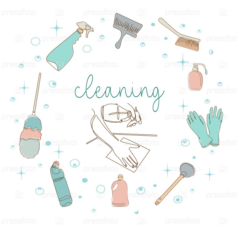 Ручно нарисованный набор уборочного оборудования, уборки и предметов для уборки в стиле эскизного doodle. Чистящие средства рисуются вручную одной линией. Векторный фон, обои