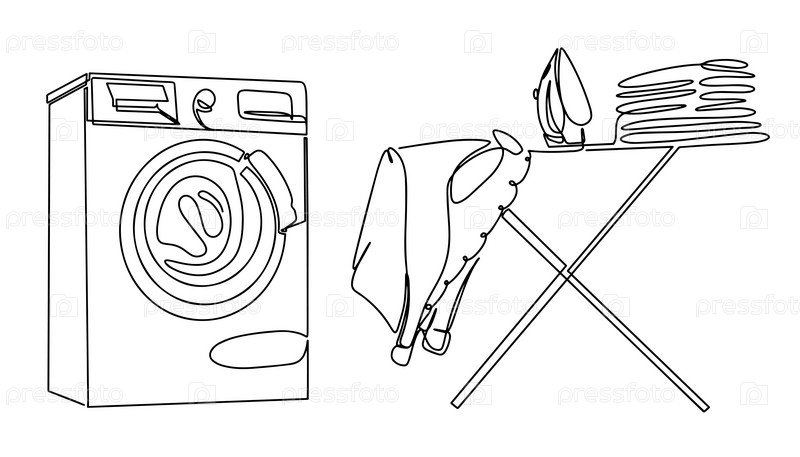 Элементы интерьера прачечной, нарисованные вручную. Символы стирки и глажки, стиральная машина, утюг, гладильная доска, вешалка, сложенная одежда. Рисунок одной линией