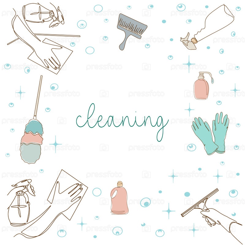 Баннер для уборки. Нарисованный вручную набор уборочного оборудования, элементы для уборки в стиле эскиза каракули. Модный фон для вашего дизайна