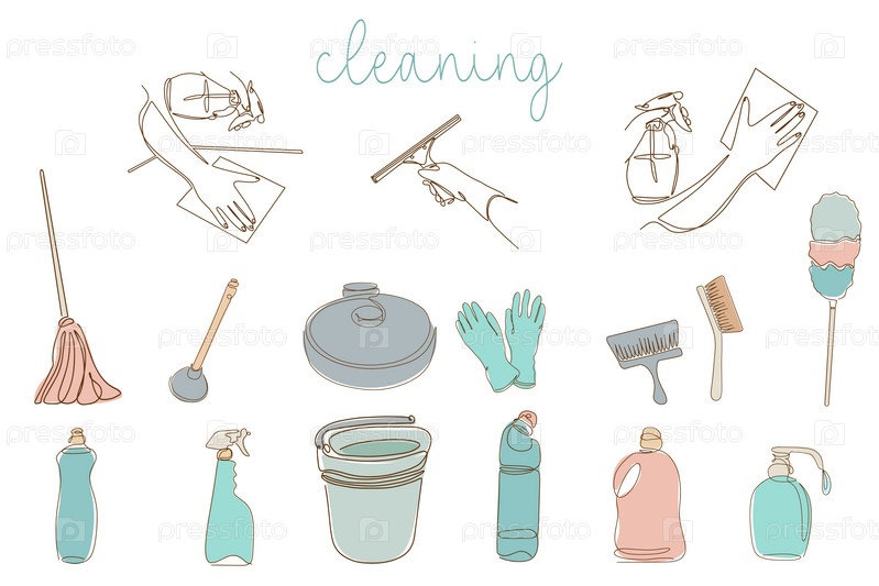 Фон оборудования для уборки. Инструменты для уборки в одну линию. Иконки предметов для уборки в линейном стиле