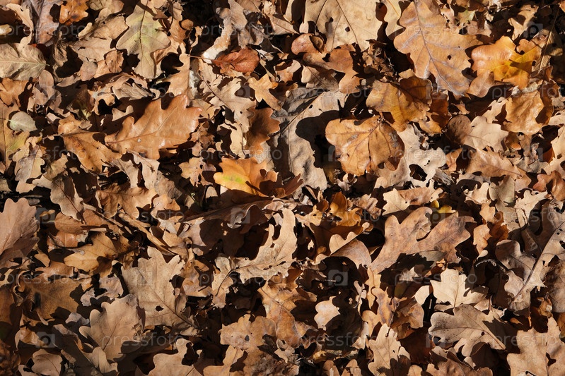 Сухие дубовые листья с каплями росы на них. Опавшие дубовые листья