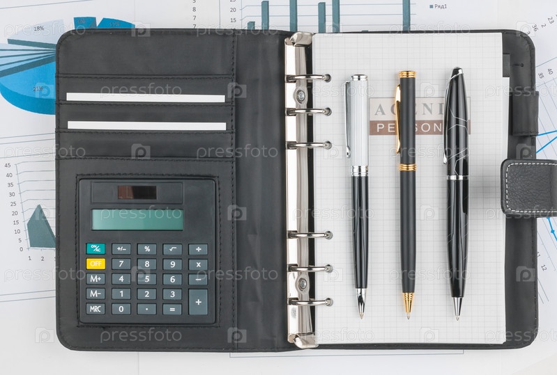Дневник, калькулятор и три ручки, лежащие на фоне диаграмм и графиков