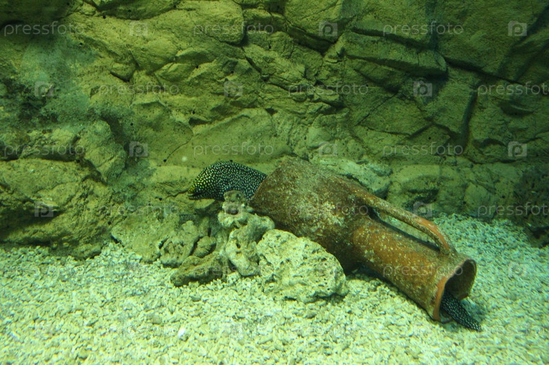Мурена меланотис на фоне камней и кувшина на дне аквариума