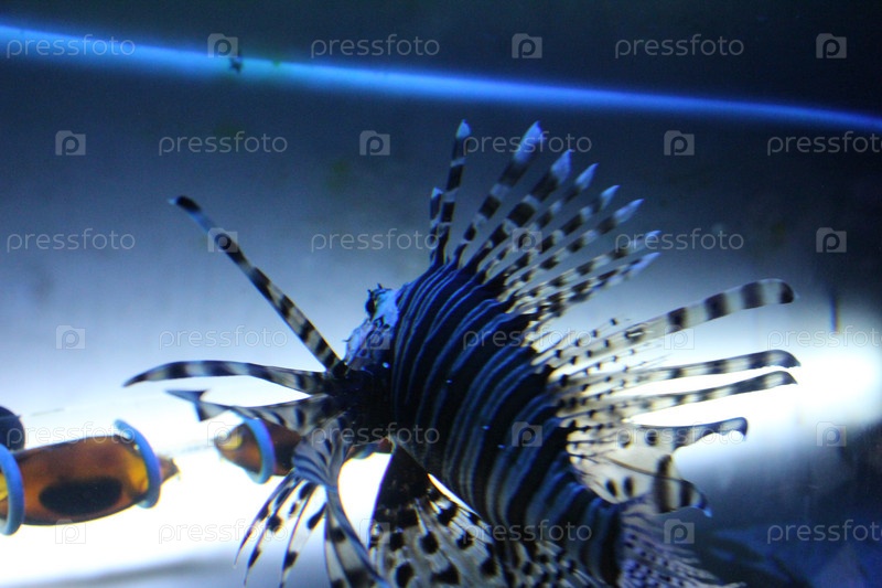 Вид Pterois volitans с спиной.Жизнь в аквариуме